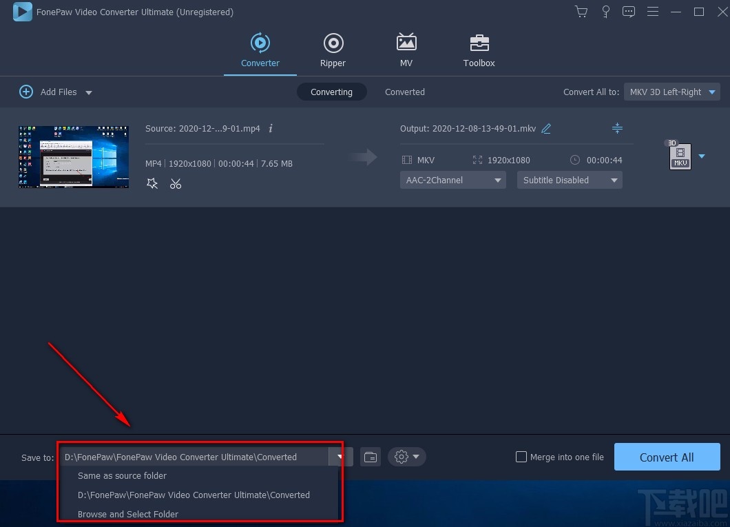 5.接下来在界面左下方找到“Save to”选项,点击该选项后面的下拉按钮,下拉框中会出现三个选项,从上往下分别表示源文件夹、软件默认的文件夹、自定义文件夹的意思,根据自己的需要进行选择。