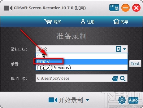 4.接下来在界面上找到“录制目标”选项,点击该选项后面的下拉按钮,我们在下拉框中选择“自定义”选项。