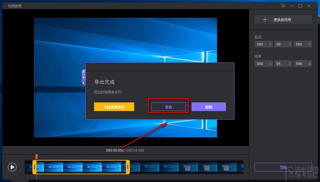 7.完成以上所有步骤后,我们就成功剪切视频了,这时候界面上会出现一个导出完成的提示窗口;我们可以点击窗口中的“查看”按钮,查看剪切后的视频文件。