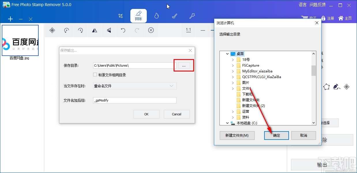 8.最后一步设置好输出保存目录之后,在界面中可以设置图片保存的名称后缀,点击OK按钮就可以将去除水印的图片保存下来了。