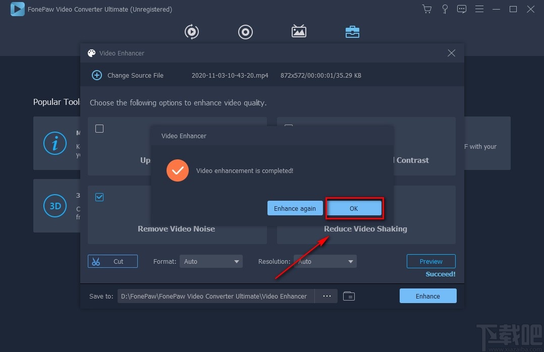 9.噪音去除成功后,界面上会出现一个提示窗口,提示我们视频优化完成,这时候点击窗口中的“OK”按钮就可以完成全部的操作步骤了。