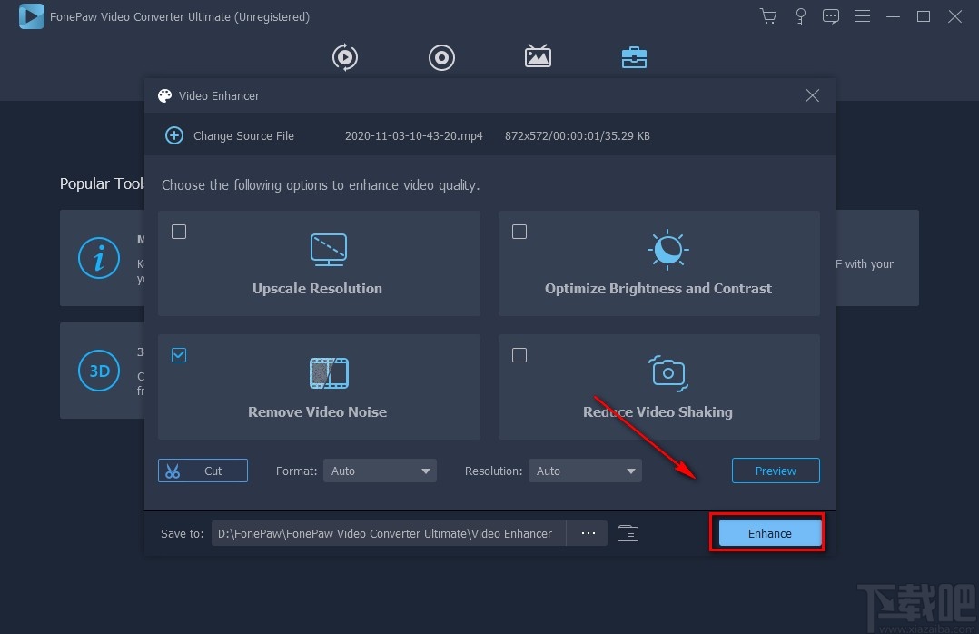 8.完成以上所有步骤后,我们在窗口右下角找到“Enhance”按钮,点击该按钮就可以开始给视频去除噪音了。