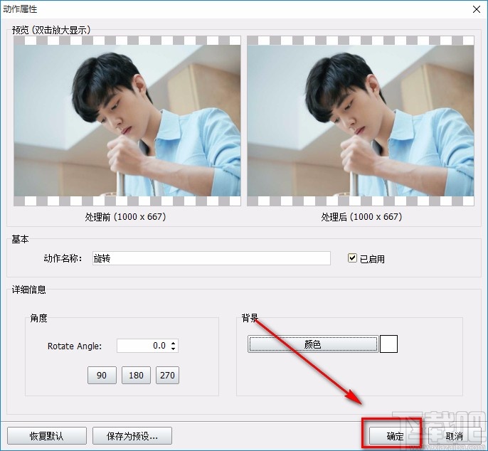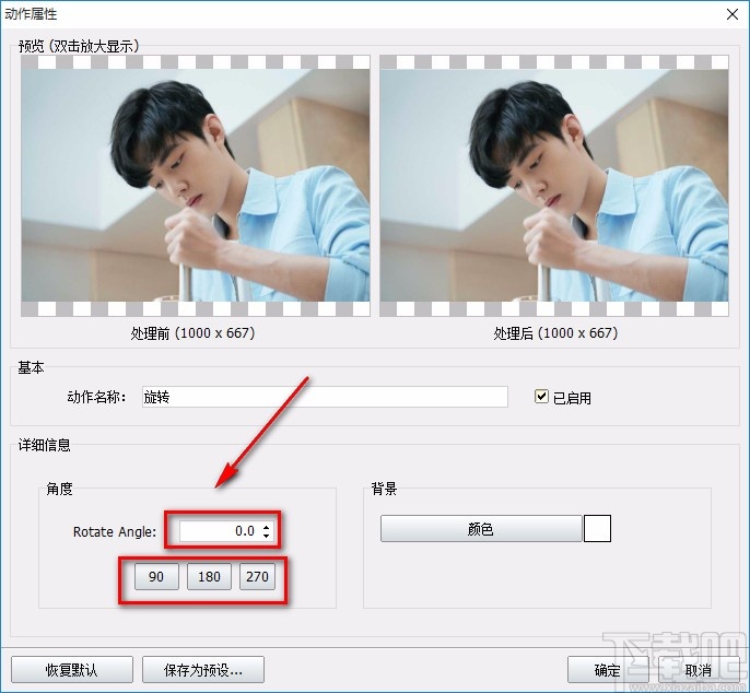 4.在动作属性窗口中,我们找到“Rotate Angle”选项,可以在该选项后面的文本框中直接输入旋转的角度数值;也可以点击文本框下方的90、180、270按钮来旋转图片。