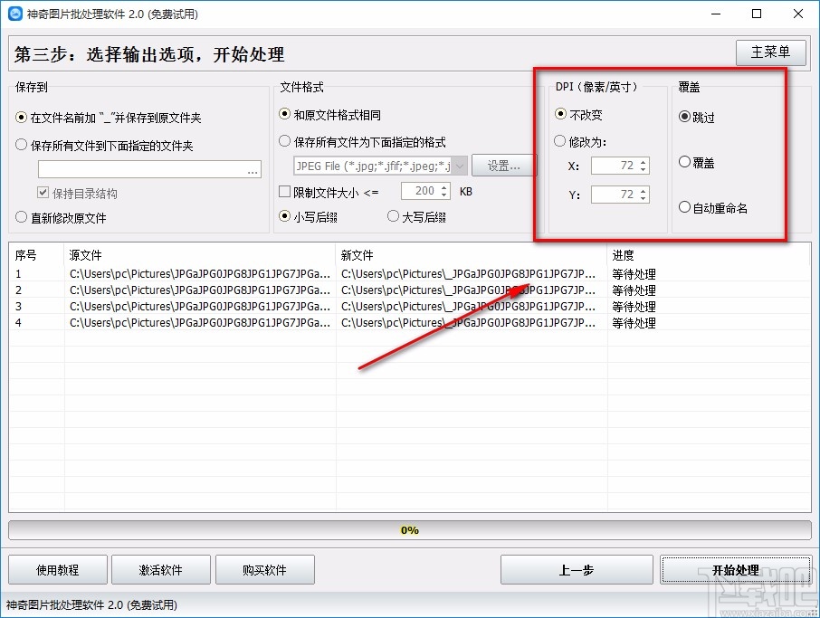 9.之后在界面上方找到“DPI”和“覆盖”两栏,我们根据自己的需要在这两栏下方对相关参数进行设置就可以了。