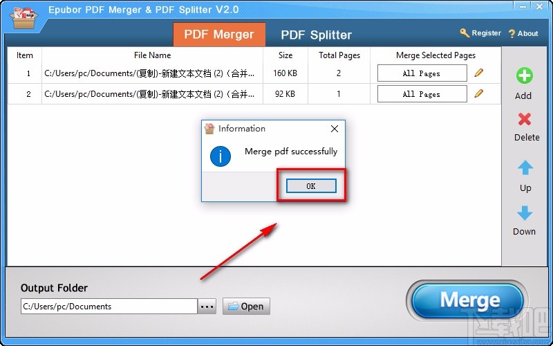 8.文件合并的速度非常快,合并结束后,界面上会出现一个合并成功的提示窗口,如下图所示;我们点击“OK”按钮就可以完成全部的操作步骤了。