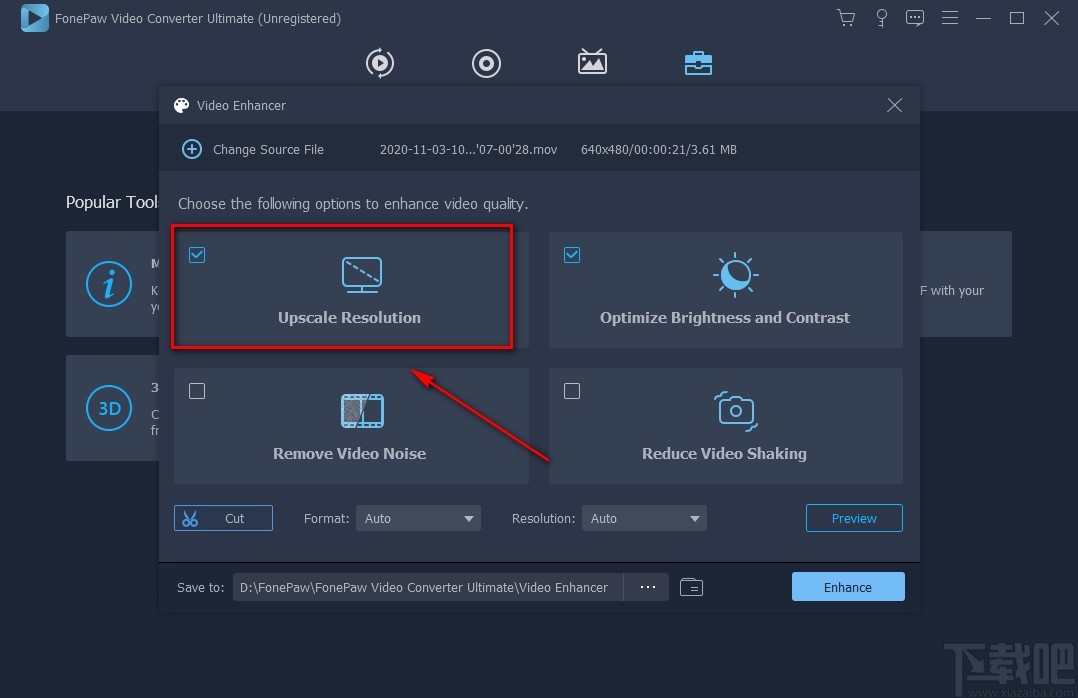 5.将视频添加到软件后,我们在窗口中找到“Upscale Resolution”选项,该选项表示优化分辨率的意思,点击该选项使其左上角的小方框打勾。