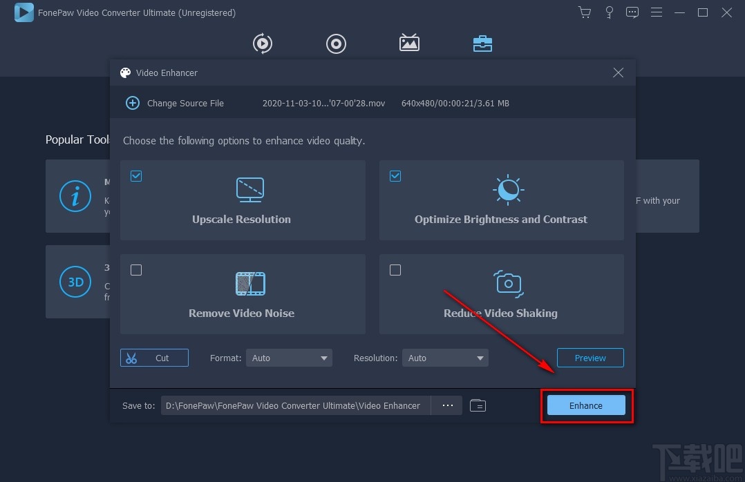 8.完成以上所有步骤后,我们在窗口右下角找到“Enhance”按钮,点击该按钮就可以开始优化视频分辨率了。