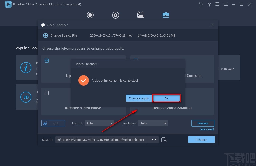 9.视频分辨率优化成功后,界面上会出现一个提示窗口,提示我们视频优化完成,这时候点击窗口中的“OK”按钮就可以完成全部的操作步骤了。