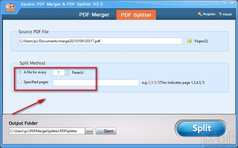 4.随后在界面上找到“Split Method”选项,该选项表示分割方式的意思,其下方有两个选项,从上往下分别表示“每几页分割成一个文件”、“固定页数分割成一个文件”的意思,根据自己的需要进行选择;并在对应的文本框中输入数值。