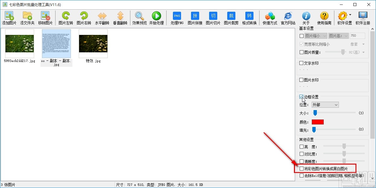 3.点击打开按钮成功添加文件到软件界面之后,下一步在界面的右下角,找到“将彩色图片转换成黑白图片”这个选项,然后勾选它。