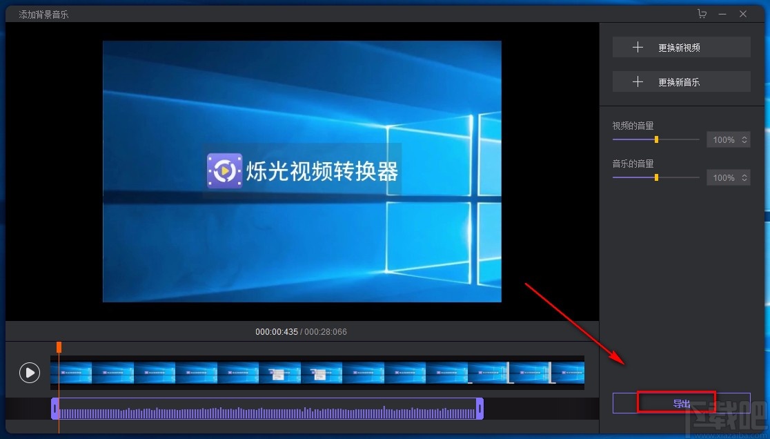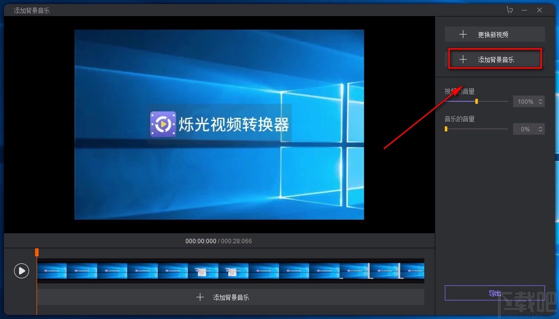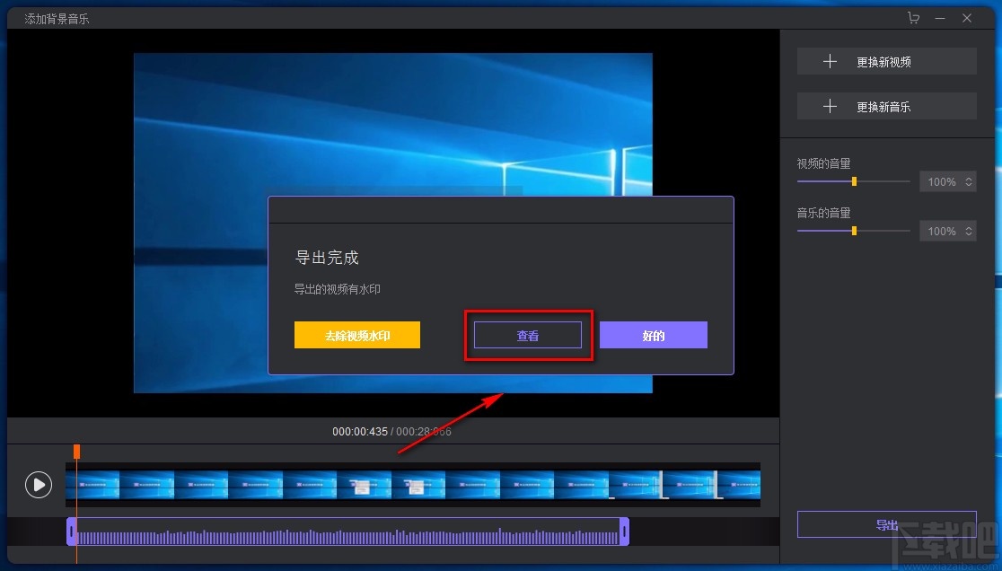 9.完成以上所有步骤后,我们就可以开始给视频添加背景音乐了;添加完毕后,界面上会出现一个导出完成窗口,我们可以点击窗口中的“查看”按钮,查看添加音乐后的视频文件。