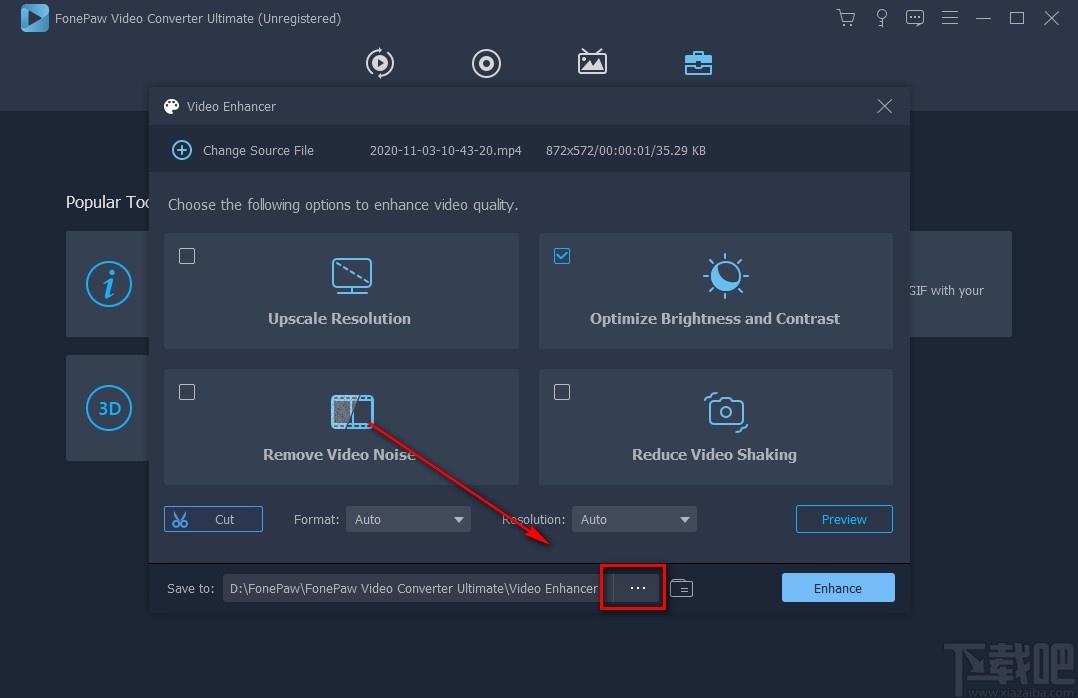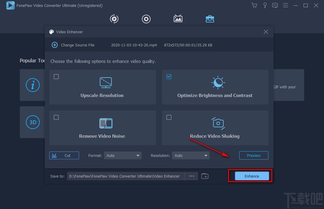 8.完成以上所有步骤后,我们在窗口右下角找到“Enhance”按钮,点击该按钮就可以开始优化视频亮度和对比度了。