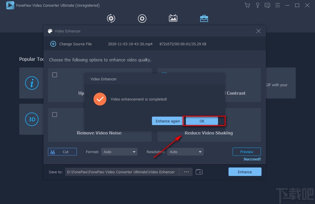 9.视频优化完毕后,界面上会出现一个窗口,提示我们优化完毕,这时候点击窗口中的“OK”按钮,就可以完成全部的操作步骤了。