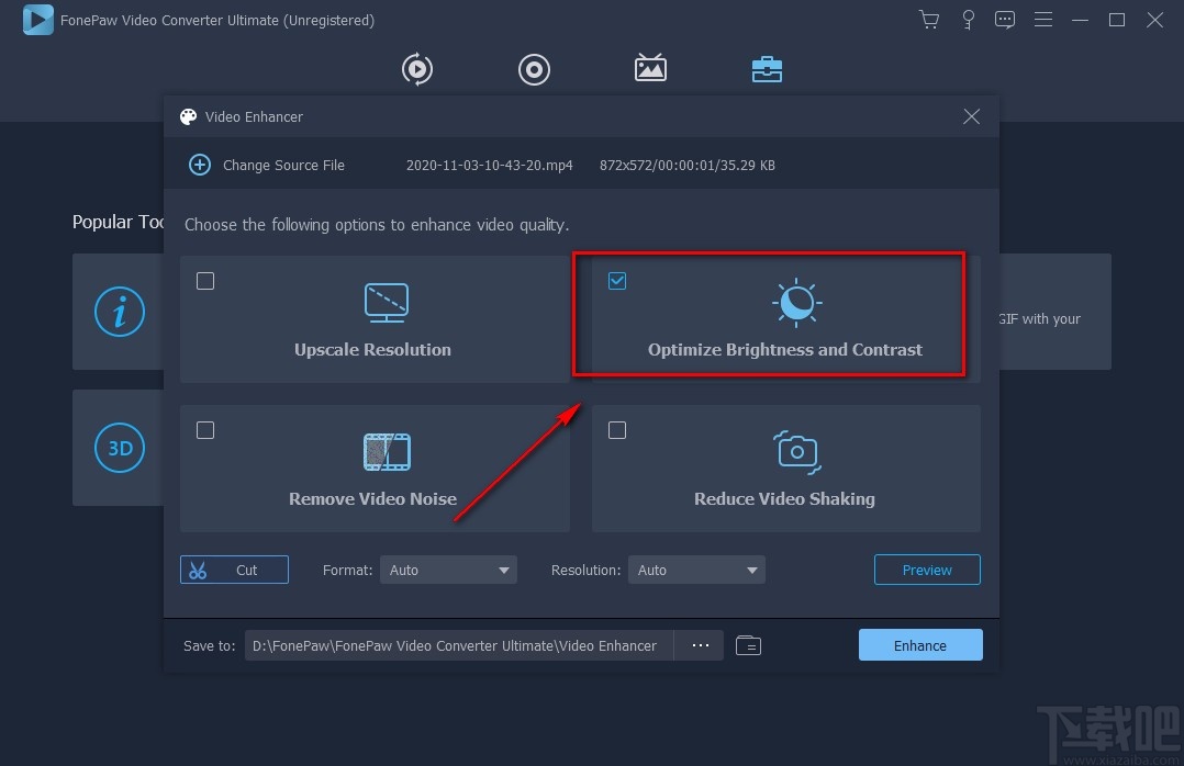 5.将视频添加到软件后,我们在窗口中找到“Optimize Brightness and Contrast”选项,该选项表示优化亮度和对比度的意思,点击该选项使其左上方的小方框中打勾。