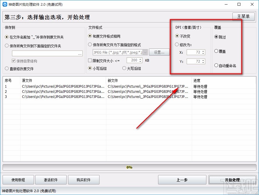 9.之后在界面上方找到“DPI”和“覆盖”两栏,我们根据自己的需要在这两栏下方对相关参数进行设置就可以了。