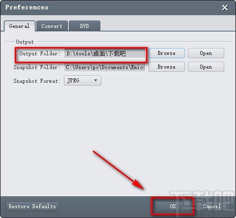 6.完成以上所有步骤后,我们在Preferences窗口中再次找到“Output Folder”选项,其后面的文本框中显示的就是刚刚所设置的默认保存位置了,这时候点击窗口右下角的“OK”按钮就可以了。