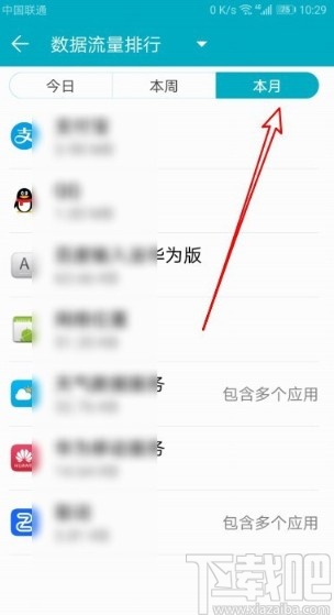 4.进入到流量排行界面之后我们就可以切换时间范围来查看每一个应用使用流量的情况,如下图中所示。