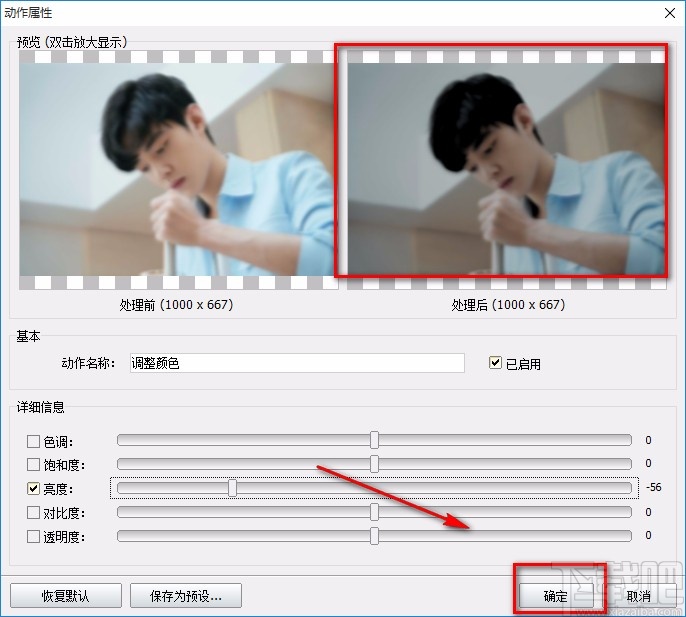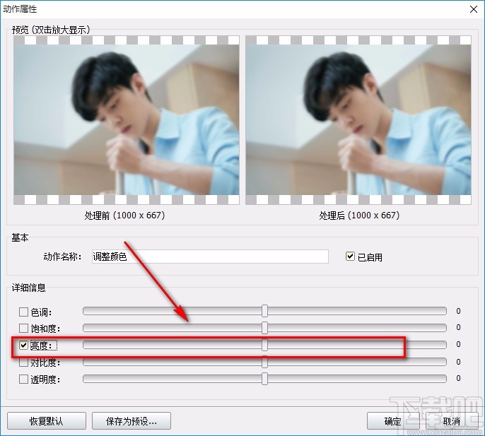 4.然后在窗口中找到“亮度”选项,我们勾选该选项后,再拖动该选项后面的小光标来调整图片的亮度。