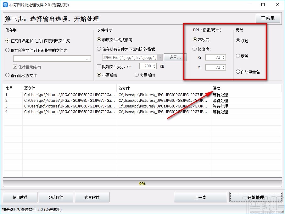 9.之后在界面上方找到“DPI”和“覆盖”两栏,我们根据自己的需要在这两栏下方对相关参数进行设置就可以了。