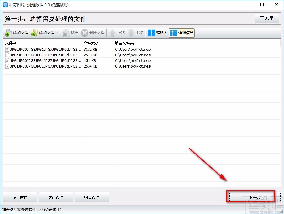 2.将图片添加到软件后,我们找到位于页面右下角的“下一步”按钮,点击该按钮就可以跳转到下一个页面。