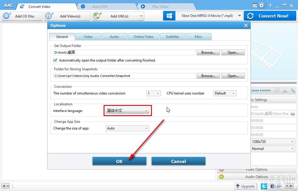 4.选择界面语言为简体中文之后,点击下方的OK按钮保存这个语言的修改操作,如下图中所示。