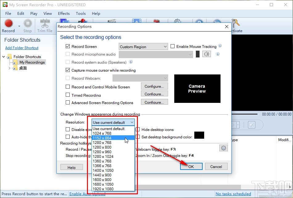 3.选择好录制方式之后,下一步在下方的Resolution选项位置,点击下拉列表之后可以选择录制区域的分辨率大小,如下图中所示,选择之后点击OK按钮即可。