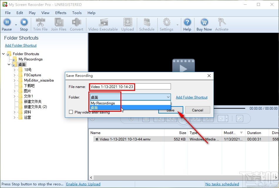 7.打开这个保存选项界面之后会出现下图所示的窗口,我们在这个窗口中设置好文件的名称,然后选择好输出文件路径,最后点击Save按钮保存录制的视频即可。