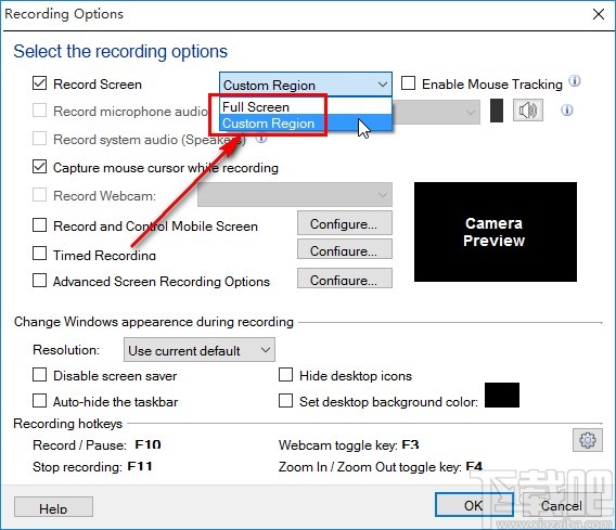 2.点击打开录制设置界面之后,点击下图所示的下拉列表选择录制的区域,其中Full Screen表示全屏录制,Custom Region表示自定义区域录制。