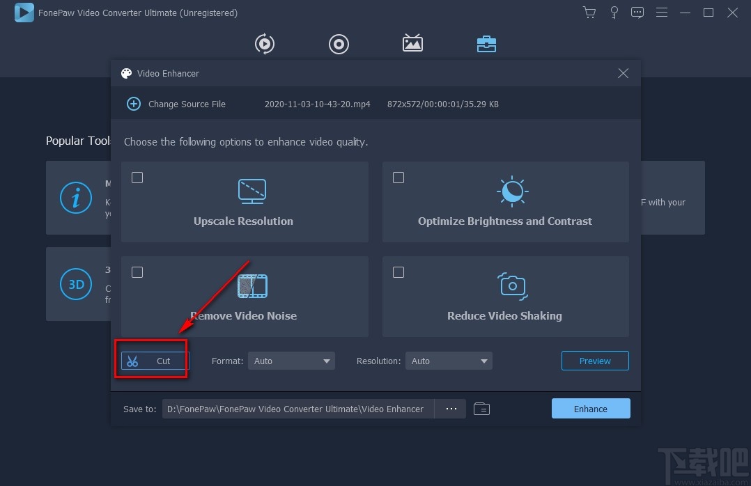 10.完成以上所有步骤后,我们在窗口右下角找到“Enhance”按钮,点击该按钮就可以开始剪切视频并将其保存在指定的文件夹中。