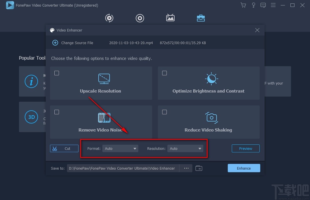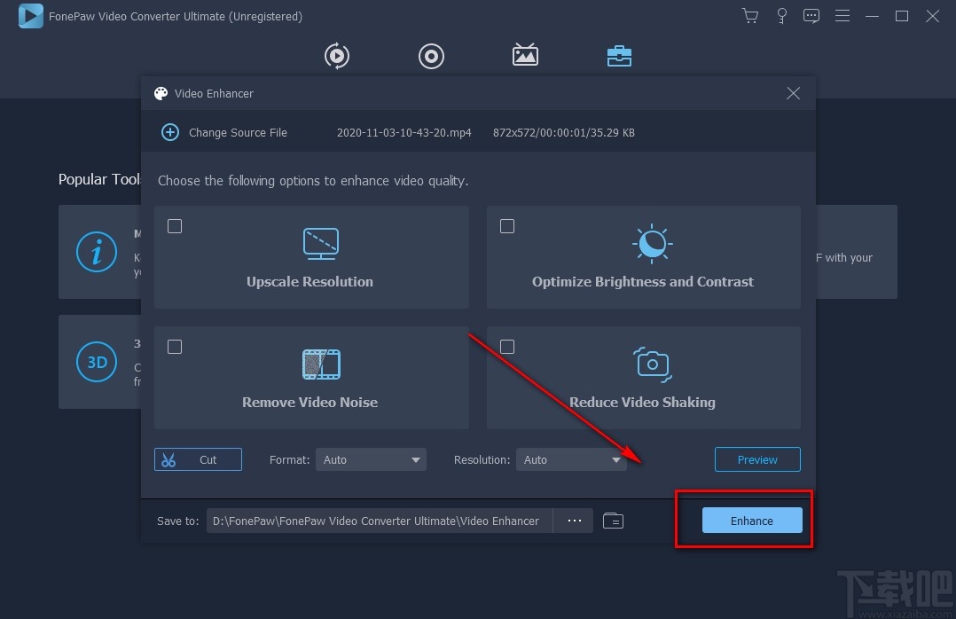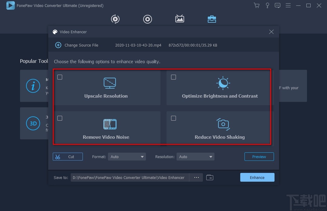 5.将视频添加到软件后,我们取消勾选“Upscale Resolution”、“Optimize Brightness and Contrast”、“Remove Video Noise”、“Reduce Video Shaking”选项,使它们前面小方框中的勾消失。