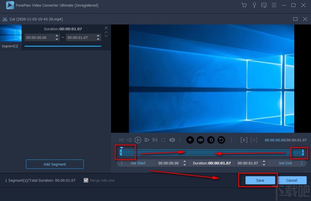 7.在视频剪切页面中,我们在页面下方找到时间进度条,将进度条左端的小光标向右移动至视频剪切开始的位置;再将进度条右端的光标向左移动至视频剪切结束的位置,并点击窗口右下角的“Save”按钮即可。