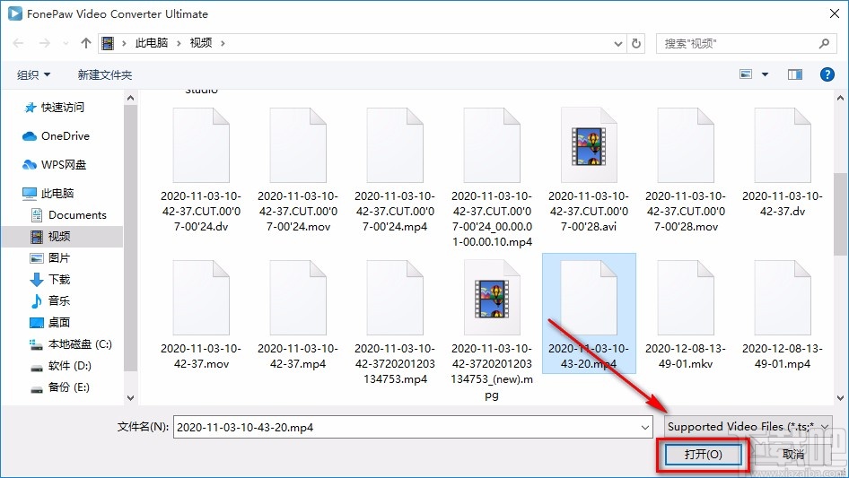 4.在文件添加页面中,我们将需要进行剪切操作的视频选中,再点击界面右下角的“打开”按钮就可以了。