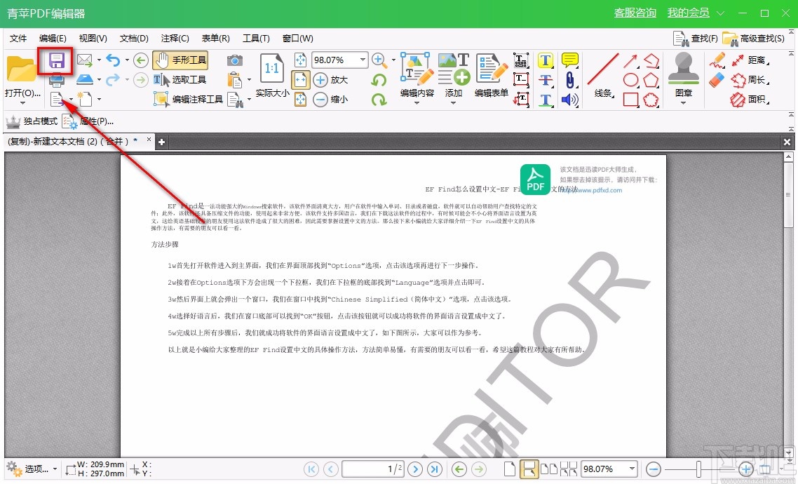 9.完成以上所有步骤后,我们在界面上就可以看到替换页面后的文档;这时候点击界面左上角的保存按钮,就可以将替换页面后的PDF文档保存在电脑中了。