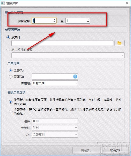 4.紧接着界面上就会出现一个替换页面窗口,我们在窗口上方找到“要替换的页面”选项,在其下方的文本框中输入需要替换的页面起始页即可。