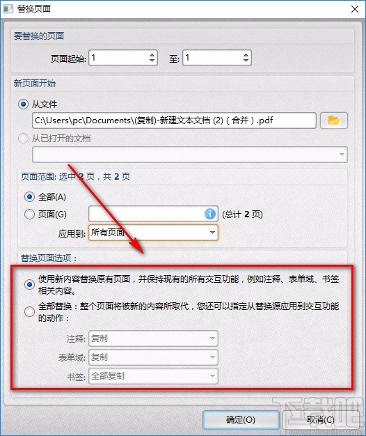 7.接下来在窗口下方找到“替换页面选项”一栏,根据自己的需要在其下方进行选择;如果选择“全部替换”选项,则还要在其下方对“注释”、“表单域”、“书签”等参数进行设置。