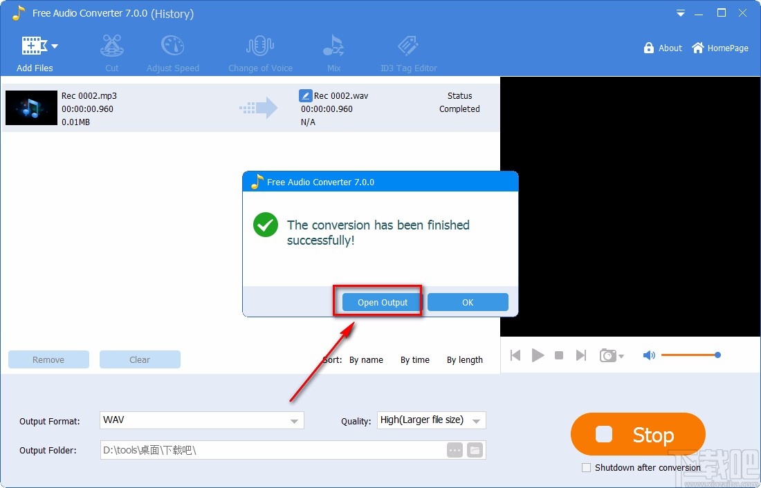 8.完成以上所有步骤后,界面上会出现一个转换成功的提示窗口,我们点击窗口中的“Open Output”按钮,就可以打开存放目录查看音频了。