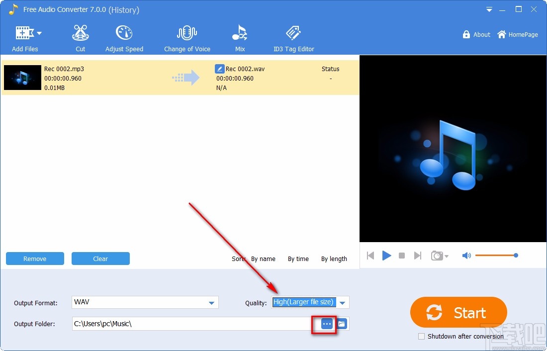 7.随后我们在界面右下角找到黄色的“Start”按钮,点击该按钮就可以开始转换音频格式了。