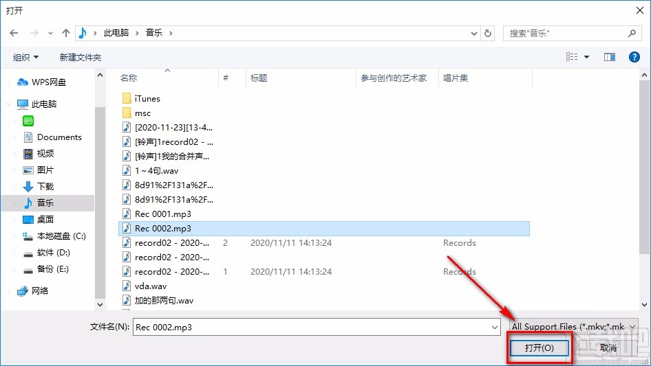 2.在文件添加页面中,我们选中需要转换格式的音频文件后,再点击页面右下角的“打开”按钮即可。