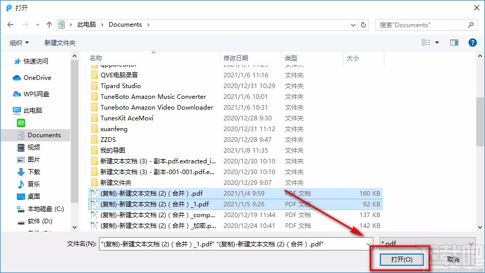 3.在文件添加页面中,我们选中需要合并的PDF文件后,再点击页面右下角的“打开”按钮就可以了。