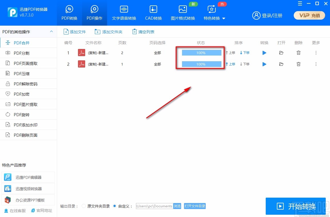 7.PDF文件合并完成后,我们在界面上方可以看到状态栏显示的是100%,如下图所示,大家可以作为参考。