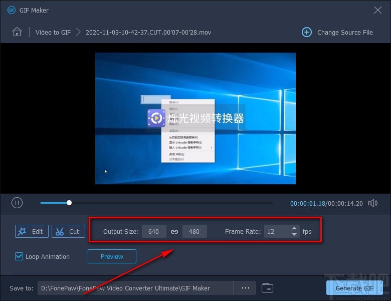 7.之后返回到GIF制作窗口,我们在窗口下方找到“Output Size”和“Frame Rate”选项,分别表示输出尺寸和帧率的意思,根据自己的需要进行设置。