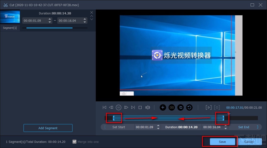 6.然后就会进入到视频剪切窗口,我们在窗口下方找到进度条,将进度条左端的光标向右移动到视频转为GIF图片开始的位置,再将进度条右端的光标向左移动到视频转为GIF图片结束的位置,并点击窗口右下角的“Save”按钮即可。