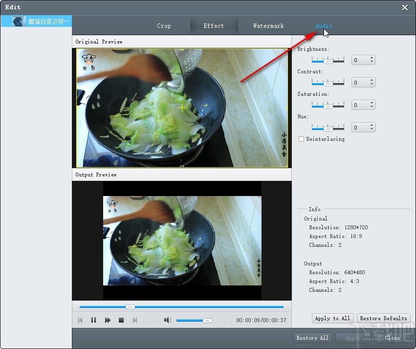 4.进入到这个编辑界面之后,在上方的功能里面选择Audio这个音频设置选项,点击切换到音频设置模块当中。