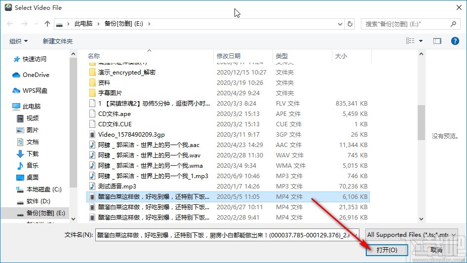 2.点击这个添加文件按钮之后,接下来会出现一个选择文件的界面,在这个界面中我们选中目标视频文件之后,点击右下角的打开按钮。
