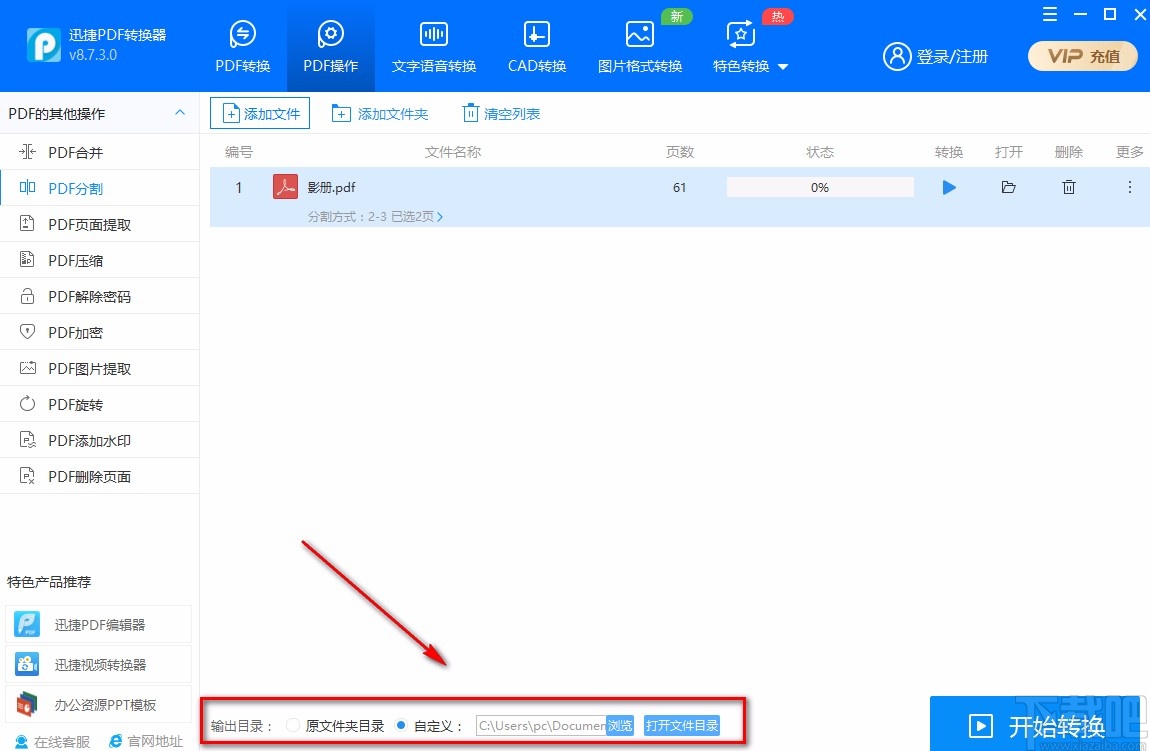 8.完成以上所有步骤后,我们在界面右下角找到蓝色的“开始转换”按钮,点击该按钮就可以开始分割PDF文件。