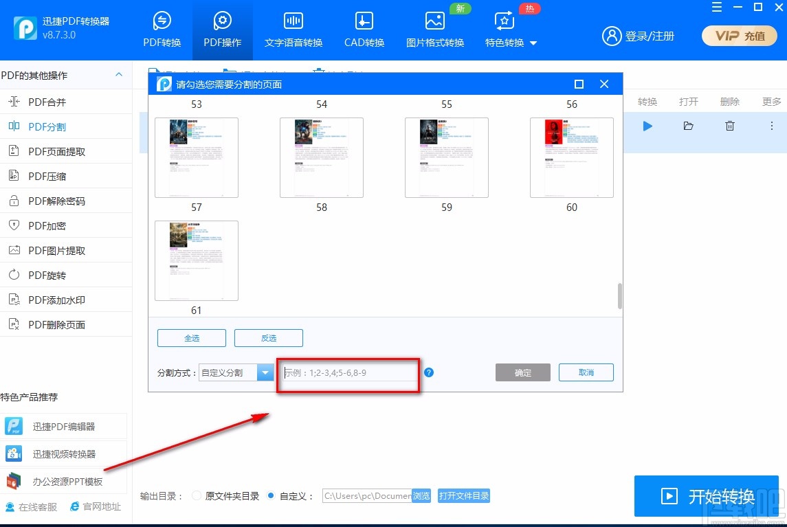 6.如果选择“自定义分割”,则在其后面的文本框中输入需要分割的页面范围,并点击窗口右下方的“确定”按钮就可以了。