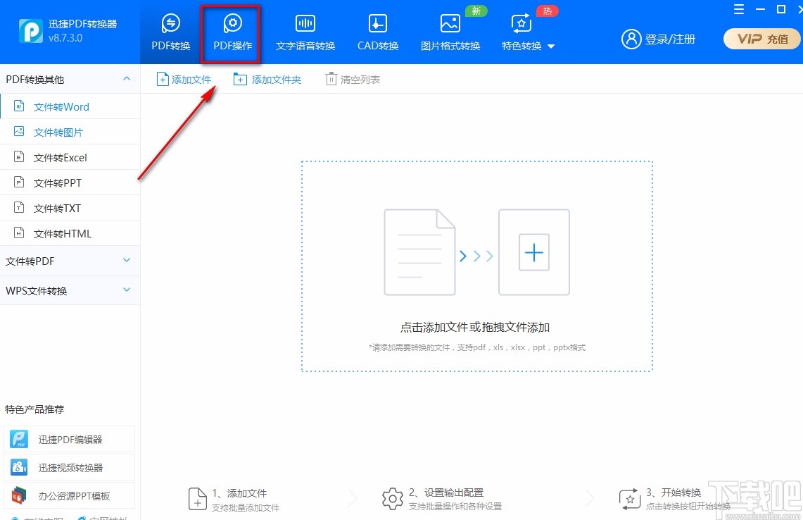 1.首先打开软件,我们在界面上方找到“PDF操作”选项,点击该选项就能进入到PDF操作页面。