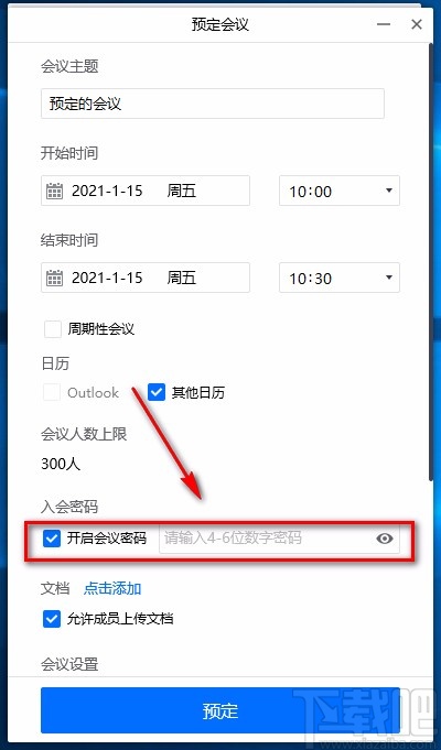 6.接下来在界面上找到“开启会议密码”选项,我们根据自己的需要决定是否勾选该选项,如果选择了该选项,则还要在其后面的文本框中输入密码。