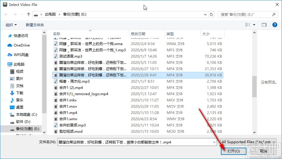2.点击这个添加文件按钮之后,接下来下一步就打开一个选择文件的界面了,在这个界面中我们选中目标视频文件之后,点击右下角的打开按钮将它添加到软件界面中。