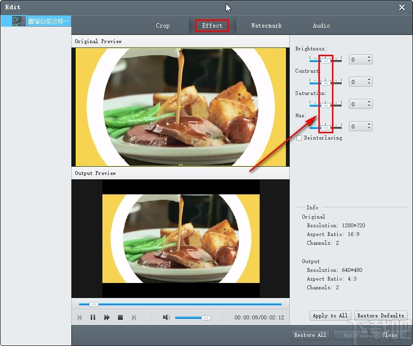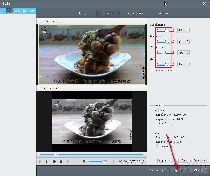 5.这些参数选项从上到下分别是调整亮度、对比度、饱和度、色调的,我们点击选中滑块之后左右滑动即可进行调整,调整完成之后点击下方的Apply应用按钮应用修改。